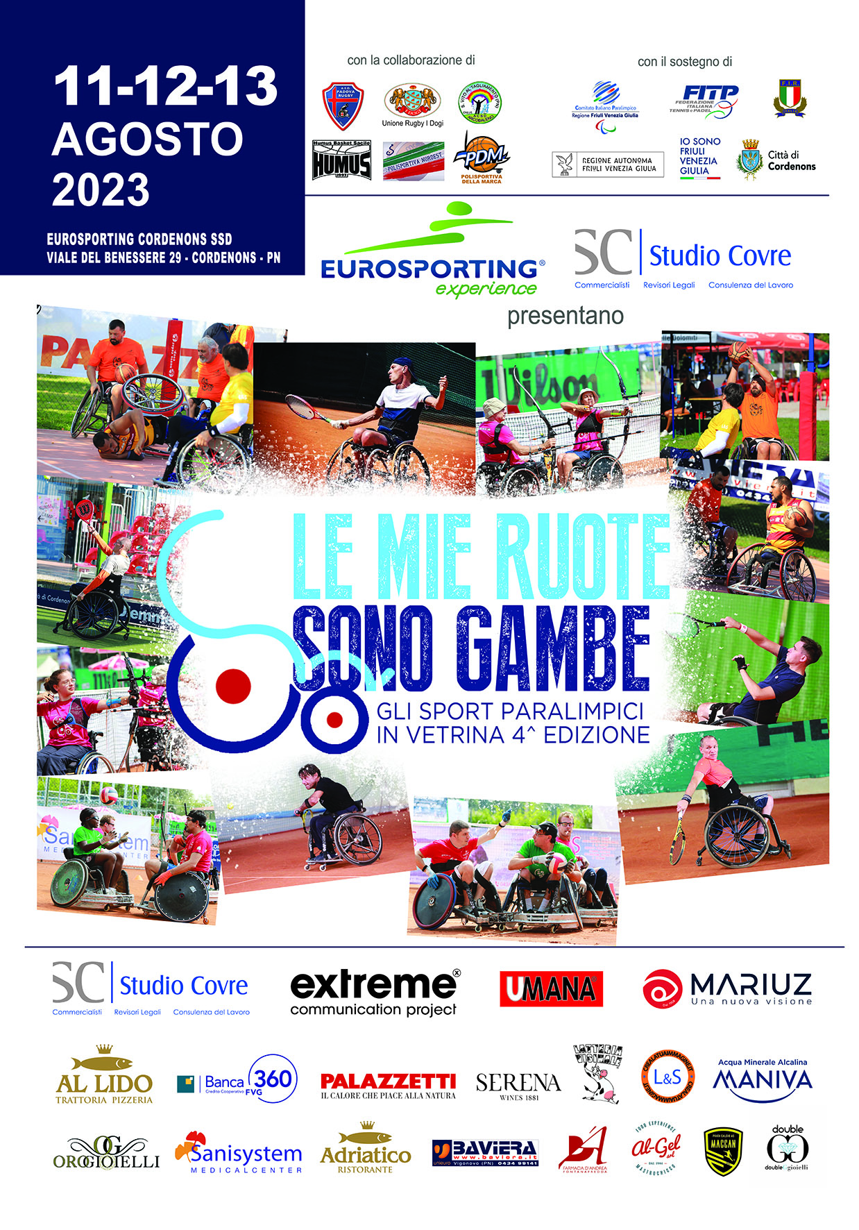 Eurosporting Cordenons e Studio Covre Brugnera sono lieti di presentare la 4° edizione di “Le mie Ruote sono Gambe” in programma dall’ 11 al 13 agosto 2023. Le discipline paralimpiche presentate sono: Tennis, Basket, Rugby, Padel e Tennistavolo.