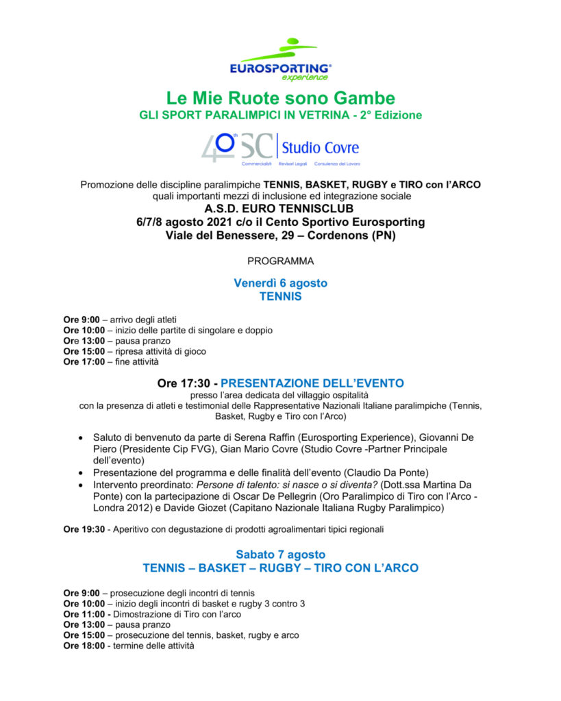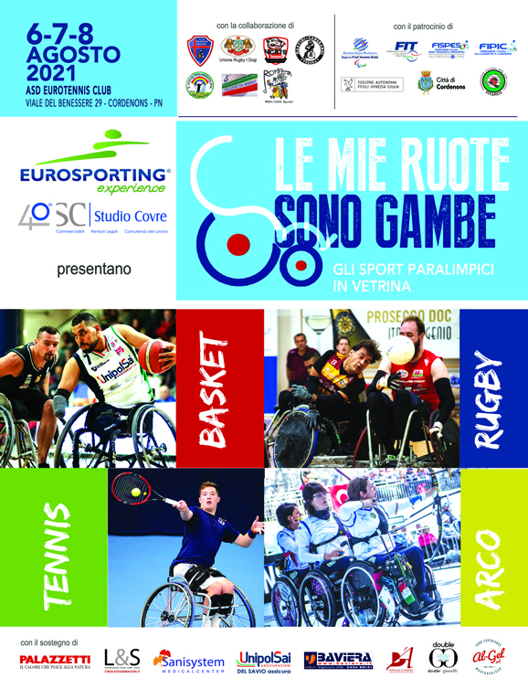 L’EUROSPORTING CORDENONS PRESENTA LA SECONDA EDIZIONE DI: “LE MIE RUOTE SONO GAMBE – GLI SPORT PARALIMPICI IN VETRINA”, MANIFESTAZIONE PROMOZIONALE DELLE DISCIPLINE PARALIMPICHE DI TENNIS, BASKET, RUGBY E TIRO CON L’ARCO, CON LA PARTECIPAZIONE DI ATLETI E TESTIMONIAL DI LIVELLO INTERNAZIONALE.