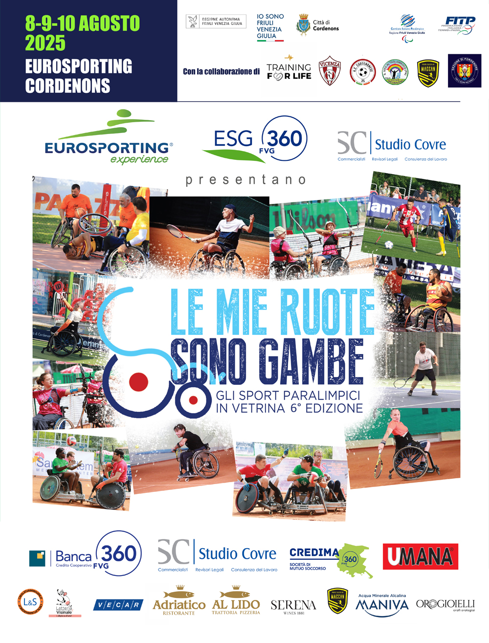 Eurosporting Cordenons, BANCA 360° FVG e STUDIO COVRE BRUGNERA sono lieti di presentare la 6° edizione di “Le mie Ruote sono Gambe” in programma dall’ 8 al 10 agosto 2025. Le discipline paralimpiche presentate sono: Tennis in carrozzina, Calcio Amputati, Tiro a segno laser e Padel in carrozzina.