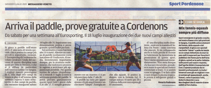 Sul Messaggero Veneto di Pordenone dell’ 9 luglio 2015 si parla dell’ apertura dei campi da Paddle all’ Eurosporting.