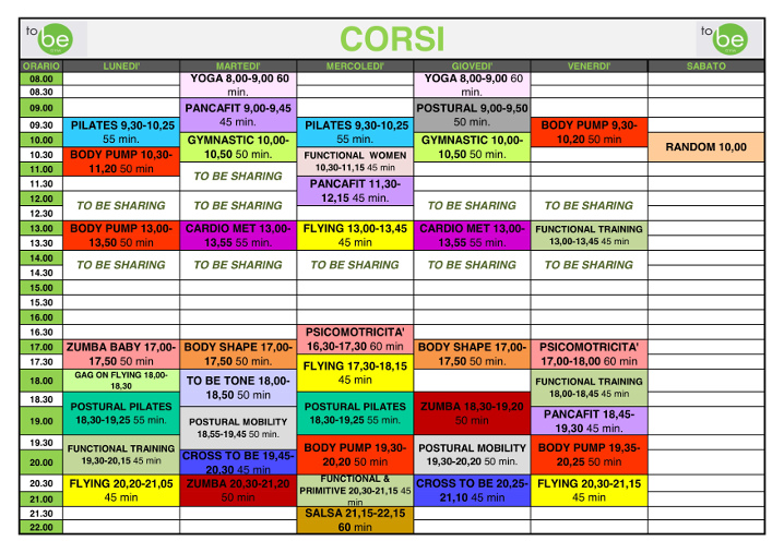 Il programma dei corsi ricopre tutta la giornata in modo da avere attività in tutte le fasce giornaliere: per che vuole iniziare con lo sport al mattino, per chi lavora e preferisce un break energico e poi la sera per un gran finale sportivo.