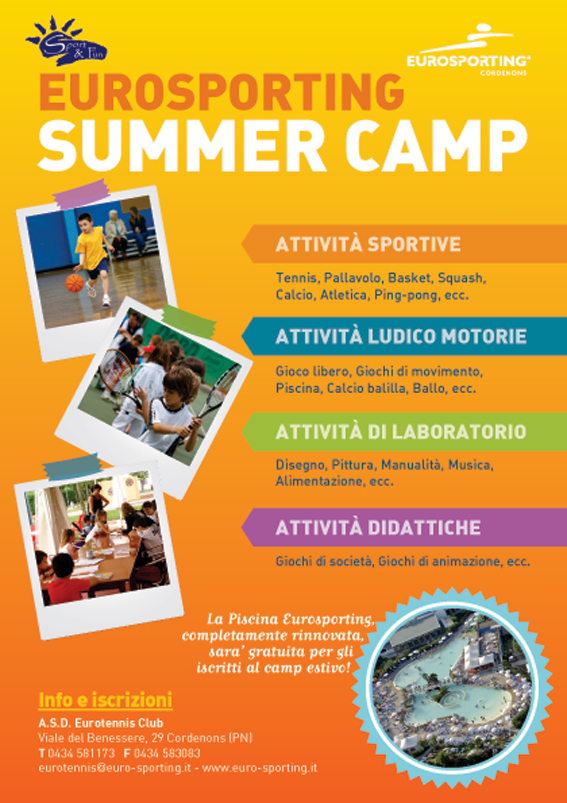 Durante il periodo estivo Eurosporting organizza dal lunedì al venerdì, dalle 8:00 alle 17:00 (è possibile frequentare il camp solo la mattina, solo al pomeriggio o la giornata intera) camp estivi per ragazzi dai 6 ai 13 anni.
