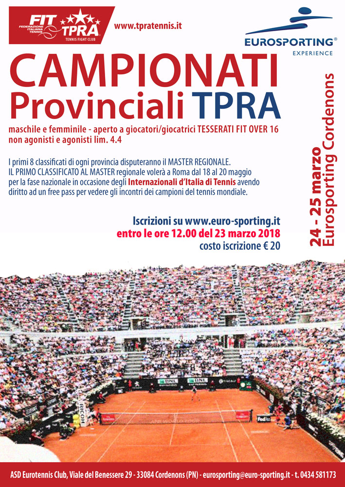 L’ASD Eurotennis Club organizza sabato 24 e domenica 25 marzo i CAMPIONATI TRPA maschili e femminili – aperto a giocatori/giocatrici tesserati FIT over 16 non agonisti e agonisti lim. 4.4