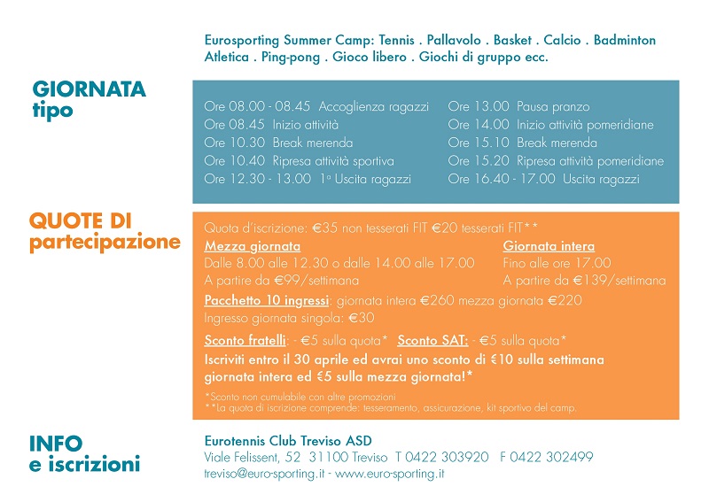 Nei mesi di giugno e luglio, ogni giorno dalle 8 alle 17 (con pausa pranzo dalle 13 alle 14) sono in programma attività sportive (tennis, ma pure pallavolo, basket, calcio, badminton, atletica, ping-pong e gioco libero) alternate a momenti di divertimento e di ricreazione. Il tutto sotto l’egida dei maestri federali di Eurosporting.