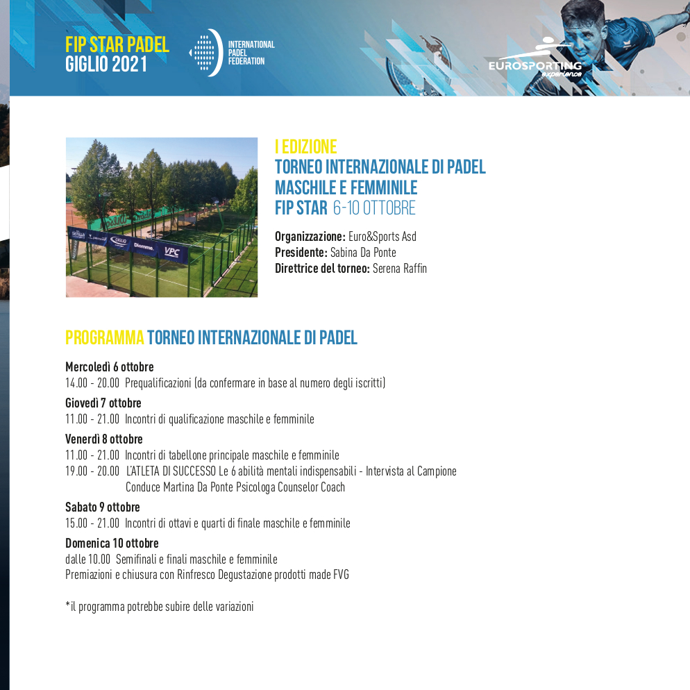 A margine della manifestazione si svolgerà “Incontro con un campione di Padel: “Le abilità mentali dell’atleta di successo” con la partecipazione della psicologa Martina Da Ponte, in programma venerdì 8 ottobre con inizio alle ore 19.