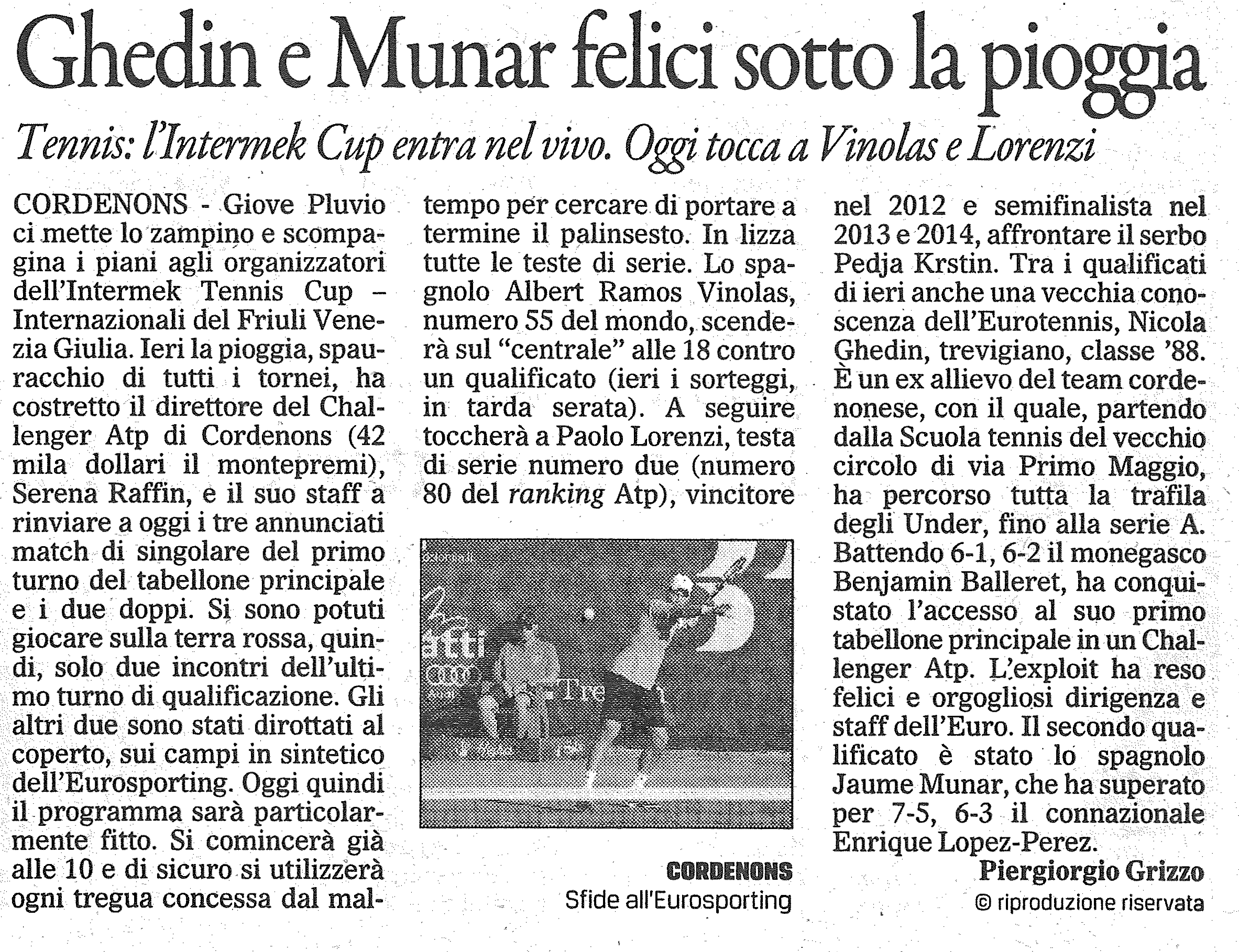 Ghedin e Munar felici sotto la pioggia Tennis: l’Intermek Cup entra nel vivo. Oggi tocca a Vinolas e Lorenzi.