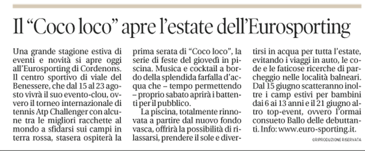 Sul Messaggero Veneto di Pordenone del 28 maggio 2015 si parla della ricca stagione estiva di Eurosporting: le feste del giovedì in piscina del Coco loco, i camp estivi per bambini dai 6 ai 13 anni, il Ballo delle debuttanti e molto altro.