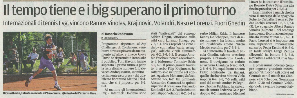 Il tempo tiene e i big superano il primo turno Internazionali di tennis Fvg, vincono Ramos Vinolas, Krajinovic, Volandri, Naso e Lorenzi. Fuori Ghedin.