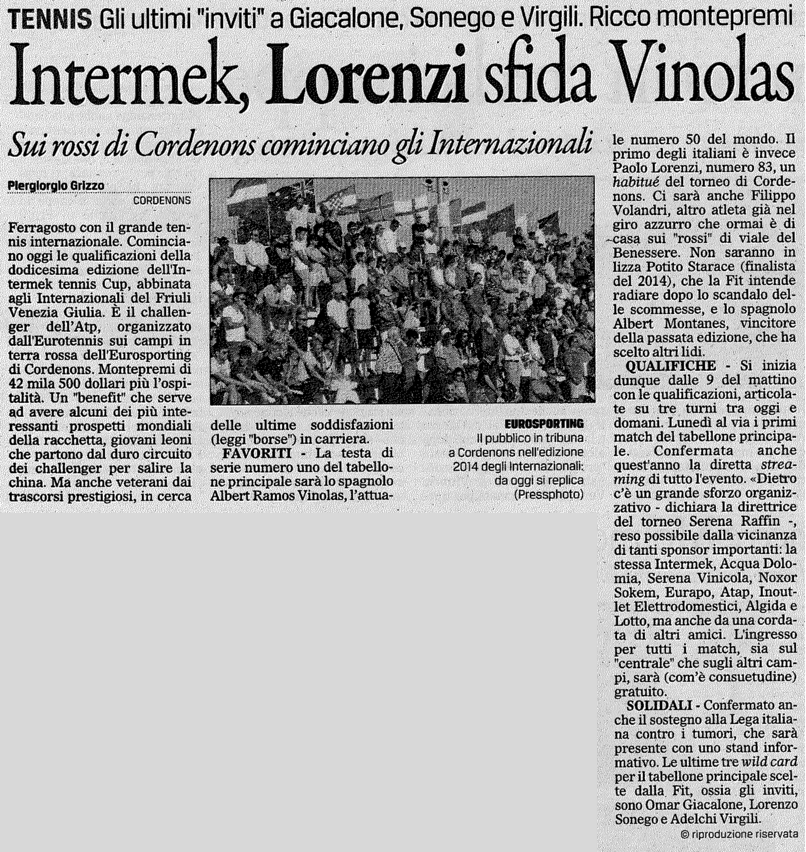 Intermek, Lorenzi sfida Vinolas Sui rossi di Cordenons cominciano gli Internazionali. Gli ultimi “inviti” a Giacalone, Sonego e Virgili. Ricco montepremi