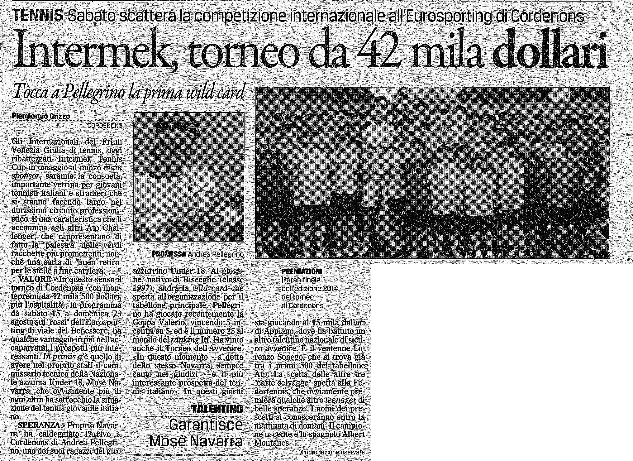 Intermek, torneo da 42 mila dollari Sabato scatterà la competizione internazionale all’ Eurosporting di Cordenons. Tocca a Pellegrino la prima wild card.