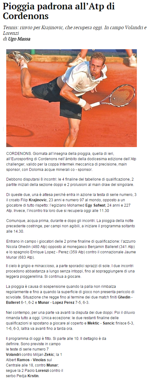 Pioggia padrona all’Atp di Cordenons Tennis: rinvio per Krajinovic, che recupera oggi. In campo Volandri e Lorenzi.
