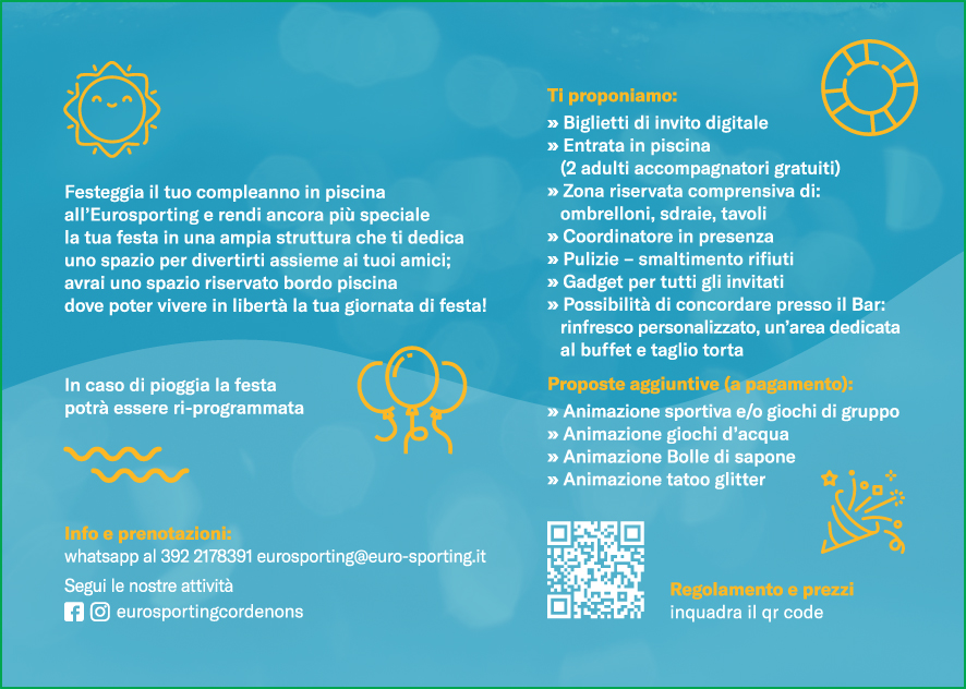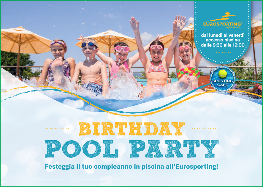 POOL PARTY: Festeggia il tuo Compleanno all’Eurosporting Format * Prezzi * Modulo d’iscrizione BIRTHDAY POOL PARTY REGOLAMENTO per l’accesso al parco acquatico durante i compleanni