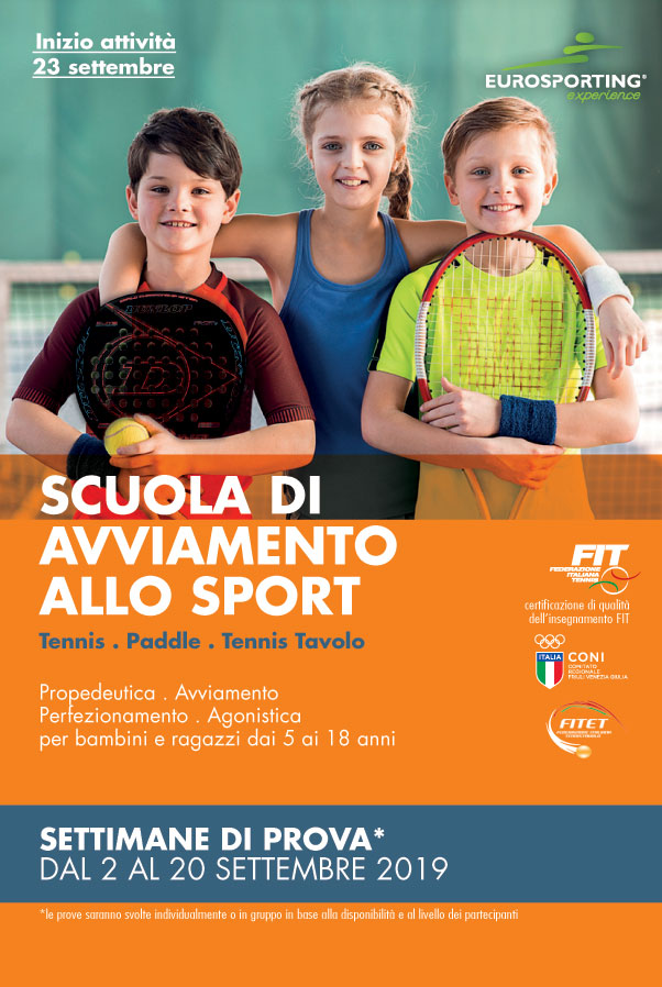 SCUOLA TENNIS * PADDLE * TENNIS TAVOLO * PROPEDEUTICA ALLO SPORT VIENI A PROVARE I NOSTRI SPORT DI RACCHETTA PRENOTA LA TUA PROVA GRATUITA CON IL MAESTRO! eurosporting@euro-sporting.it t. 0434 581173 scarica il volantino informativo >
