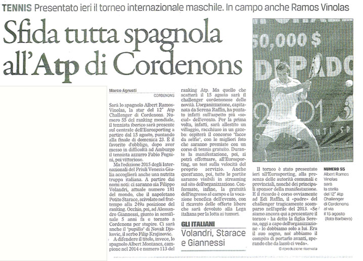 Sfida tutta spagnola all’ATP di Cordenons Sul Gazzettino di Pordenone del 31 luglio 2015 si parla del torneo internazionale di tennis che si terrà presso Eurosporting dal 15 al 23 agosto.