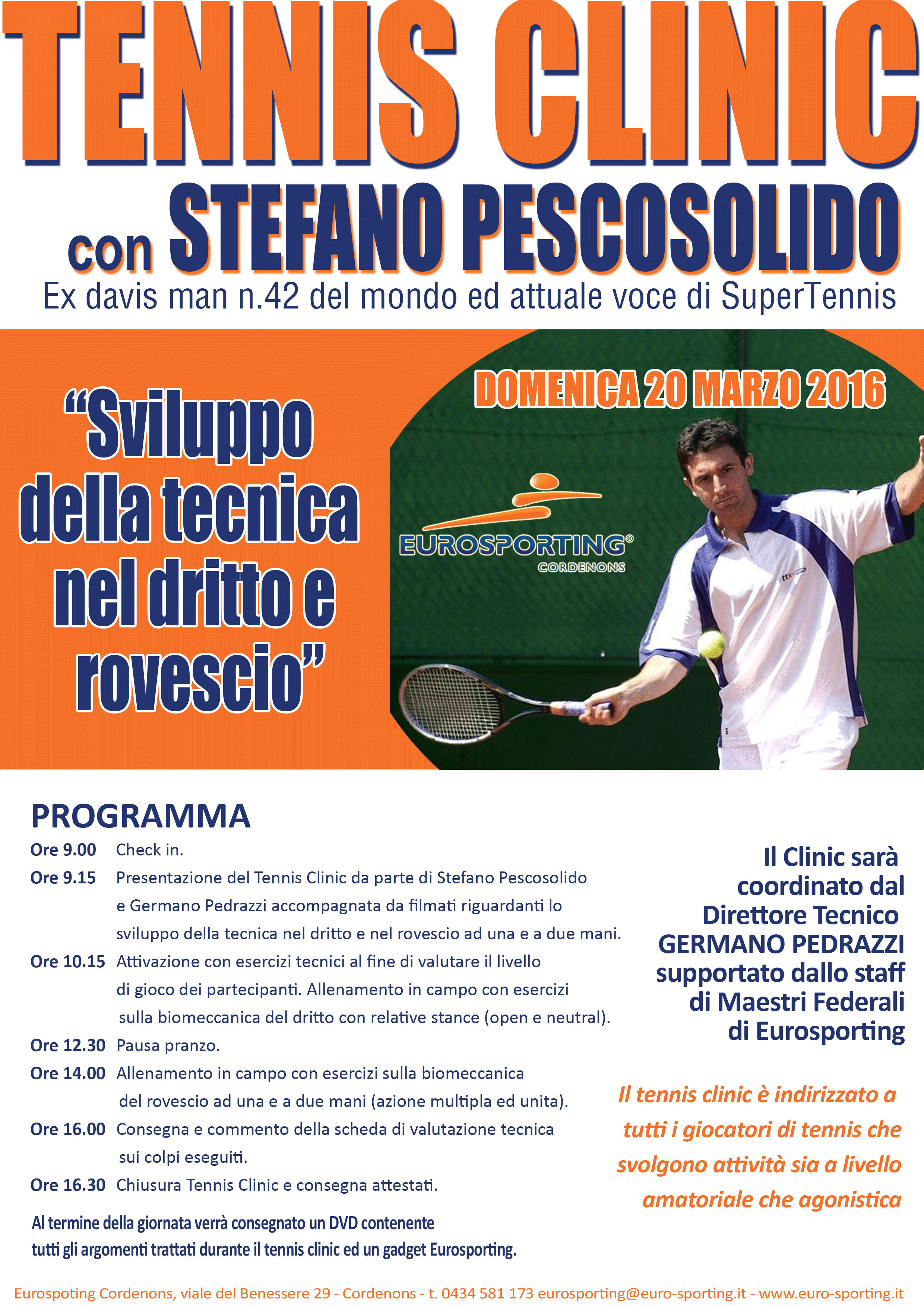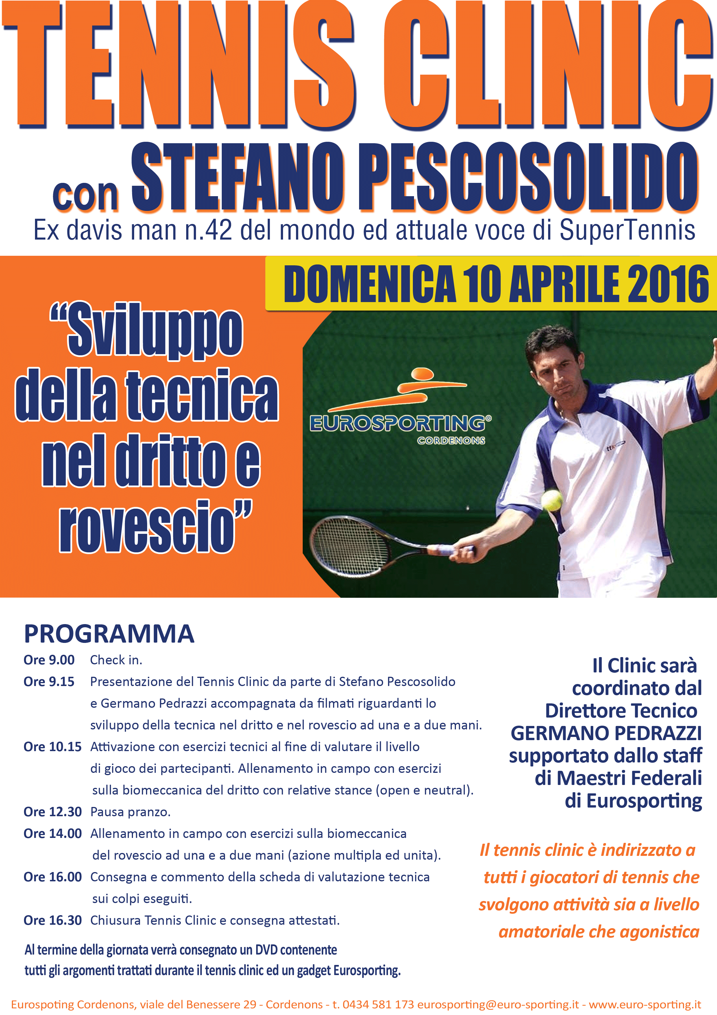 Domenica 10 aprile (ATTENZIONE AL CAMBIO DI DATA) l’Eurosporting di Cordenons ospiterà un nuovo Tennis Clinic con la partecipazione di Stefano Pescosolido, ex davis man, numero 42 al mondo e attuale voce per SuperTennis.