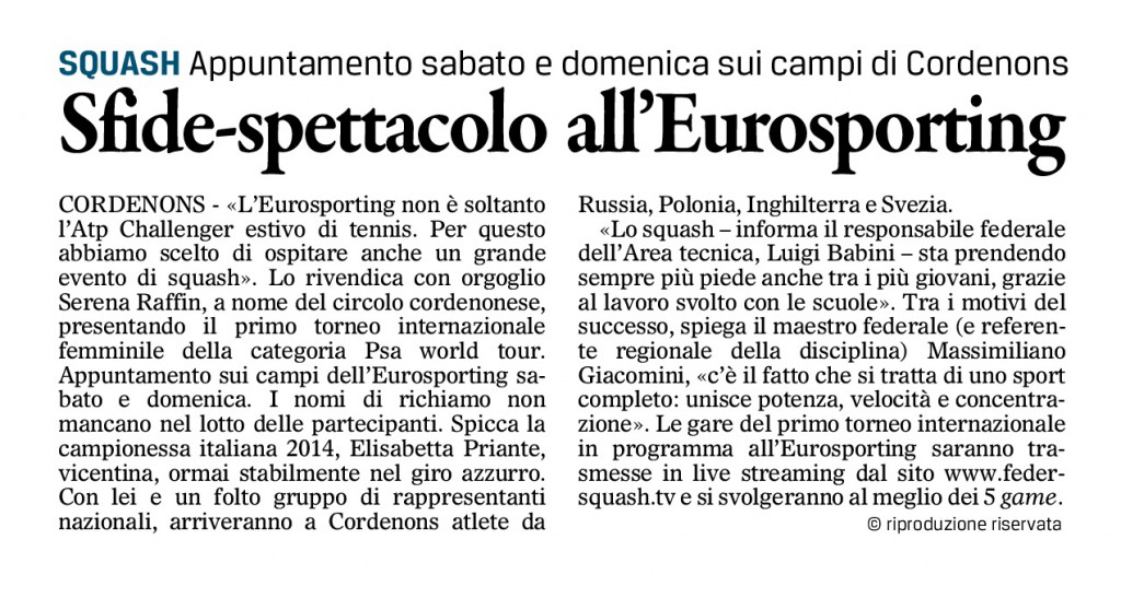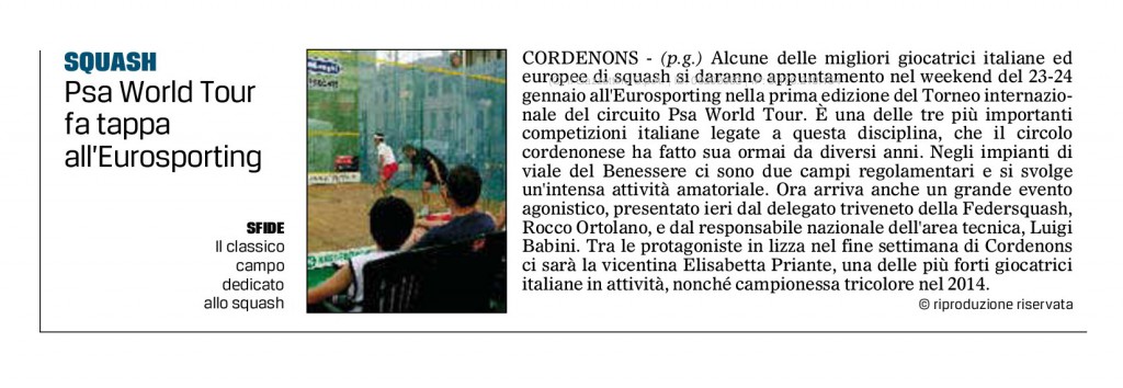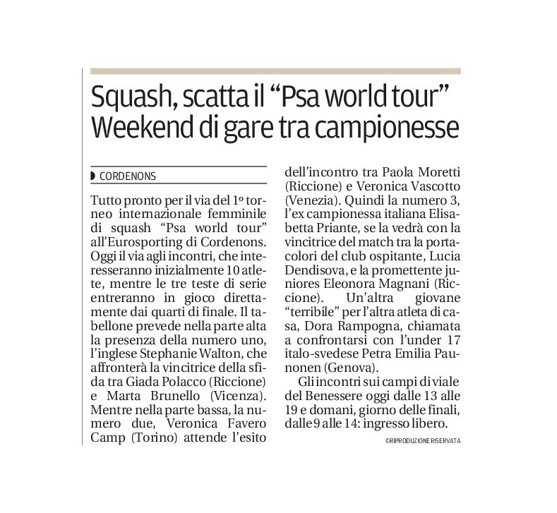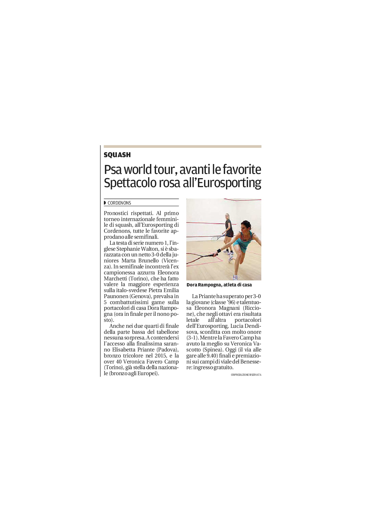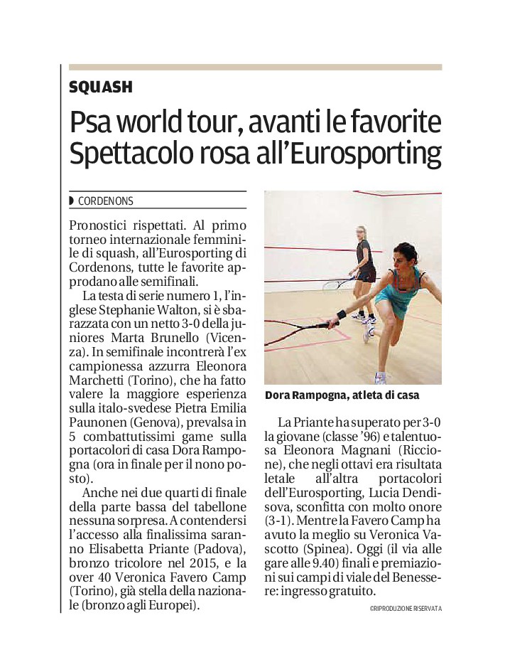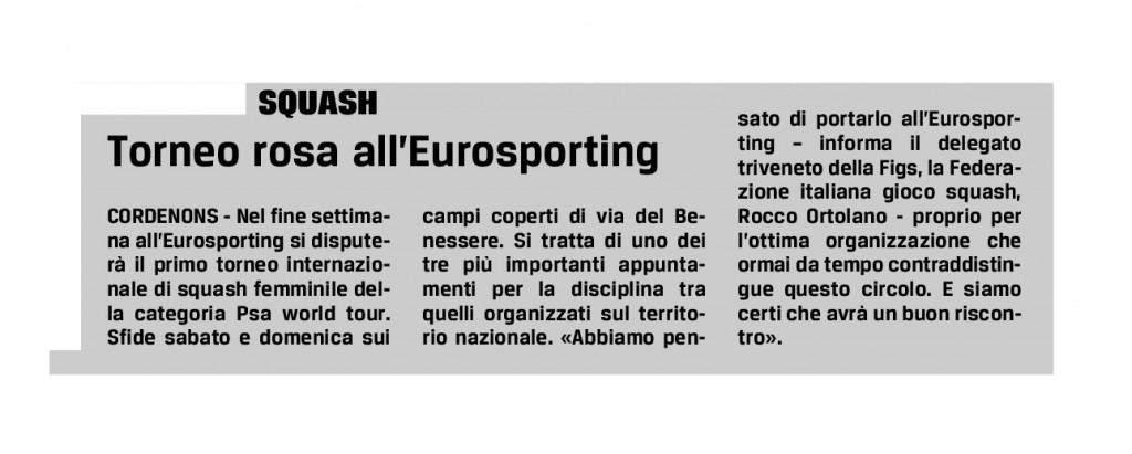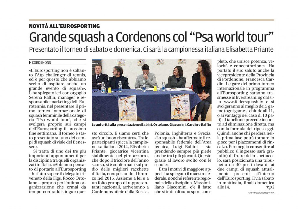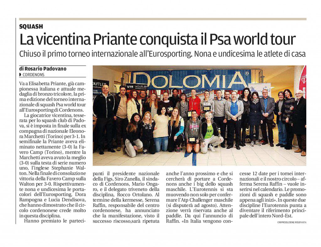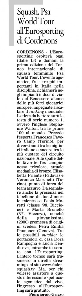 Il primo torneo internazionale femminile di squash “PSA WORLD TOUR” organizzato all’Eurosporting di Cordenons il 23-24 gennaio 2016 si è fatto leggere…: