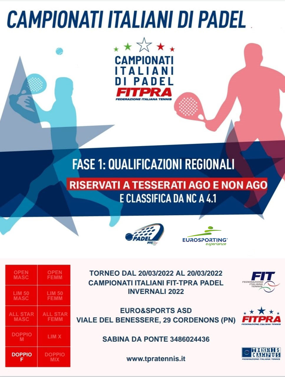 Domenica 20 Marzo Eurosporting Cordenons ospiterà una tappa regionale di qualificazione ai campionati nazionali FITPRA 2022. Il torneo sarà FEMMINILE per TESSERATE FIT AGONISTE con classifica da 4.1 a 4 nc o FIT NON AGONISTE