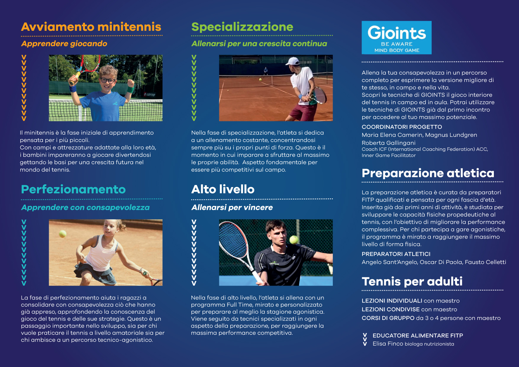 Aperto a tutti gli appassionati del tennis permette di svolgere questo sport a due passi dalla città ma allo stesso tempo in un contesto rilassante e accogliente grazie alla presenza del Ristorantino L’Invito e dell’innovativa Palestra.