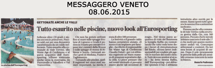 Sul Messaggero di Veneto di Pordenone dell’ 8 giugno 2015, si parla della prima domenica di vera estate alla rinnovata piscina di Eurosporting.